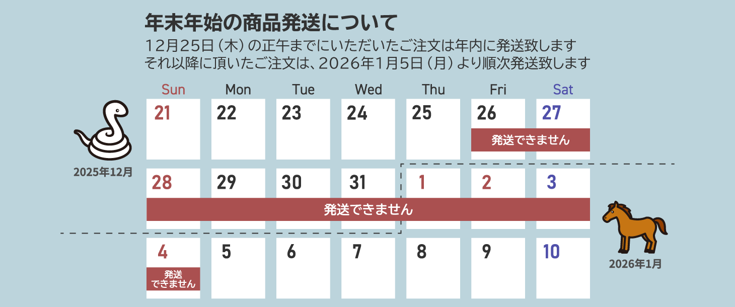 2025年12月25日午後以降のご注文分は、2026年1月5日より順次発送いたします。